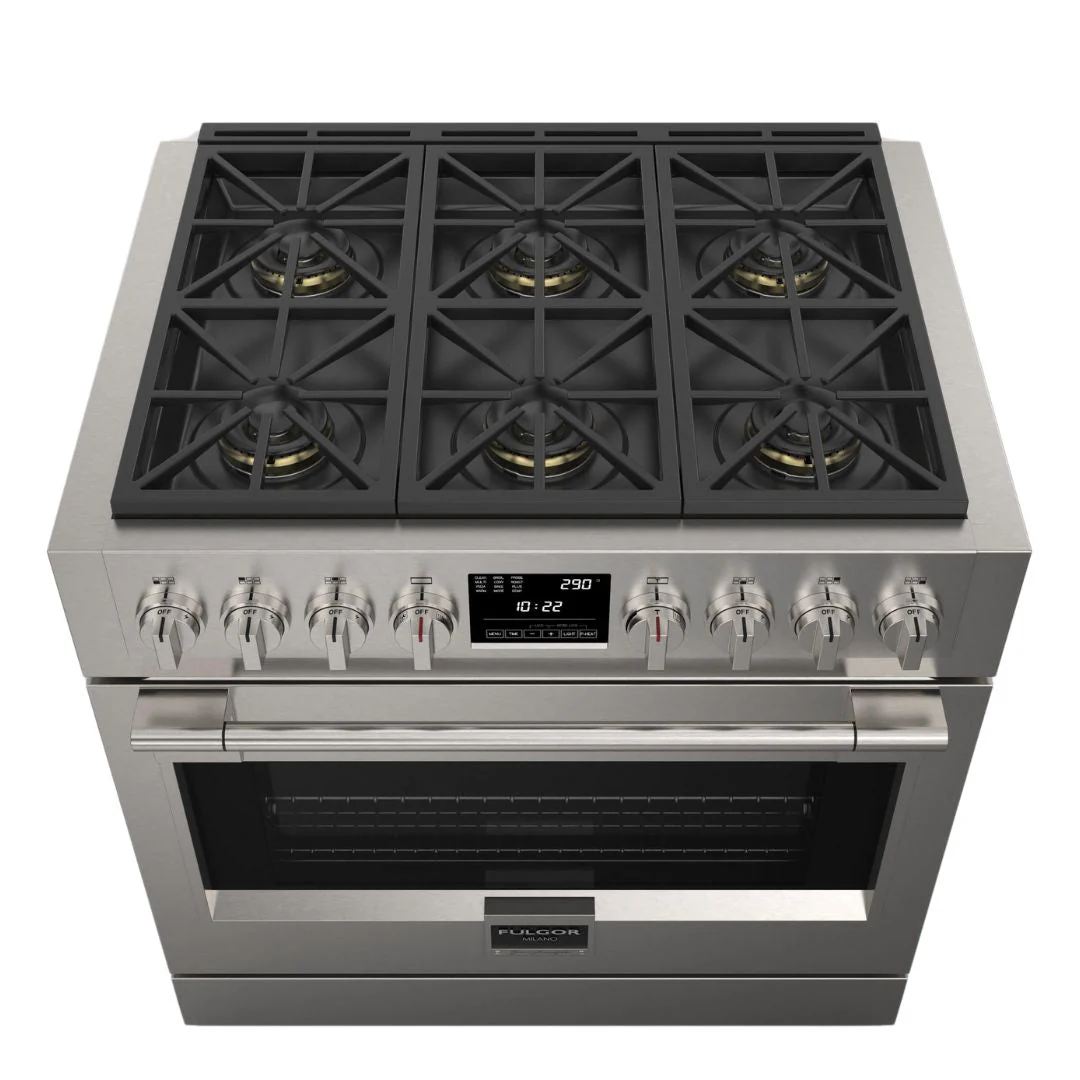 Experience the perfect balance of power, precision, and elegance with the Fulgor Milano Sofia 36” 5.7 cu. ft Stainless Steel Dual Fuel Range F6PDF366S1. Designed for both passionate home chefs and culinary professionals, Sofia delivers exceptional performance through its thoughtfully engineered 6-burner cooking surface, each featuring Fulgor’s signature 5-in-1 Dual Crescendo burners. The heavy-duty, continuous cast iron grates provide a seamless surface for effortless movement of cookware, while the one-piece porcelain burner bowl ensures durability and easy cleaning. Every detail of this range reflects Italian craftsmanship and innovation, making it a centerpiece of both style and functionality in any kitchen.